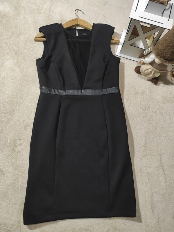 Гарної якості класична чорна сукня.Тканина дуже щільна і еластична.Спереду на грудях вшита вставка з густої сіточки,але вона прозора.Відрізне по талії з шкіряним вшитим пояском.Взаді застібається на ґудзик.Збоку є змійка.Пог-48.Пот-40Поб-48.Всі об'єми потягнуться на 2см.Довжина-93.Ширина спинки-35.Стан нової речі.