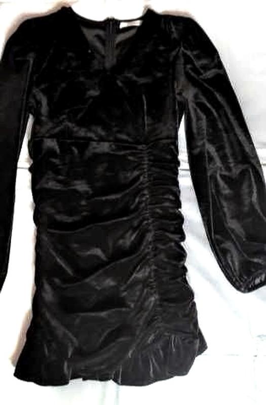 Черное привлекательное велюровое платье с драпировкой, длинными рукавами.