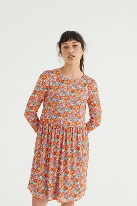 Бренд Oliver Bonas! Сукня кльош вільного крою з трохи завищеною талією. Матеріал щільна сіточка, рукава просвічують. Є підкладка. Підійде на зріст +/- 170. Заміри: напівобхват грудей - 44 см напівобхват талії - 44 см напівобхват стегон - 70 см довжина від плеча до талії- 38 см довжина повна - 91 см рукав - 62 см Склад: 100% поліестер