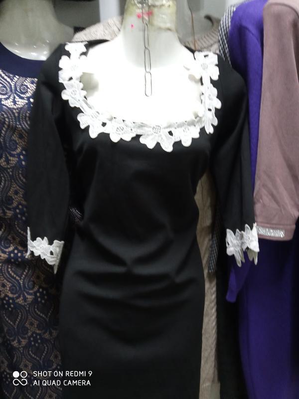 Платье с вырезом украшено белыми цветками. Ткань Дайвинг. Имеет два размера. есть много моделей, но более дорогих