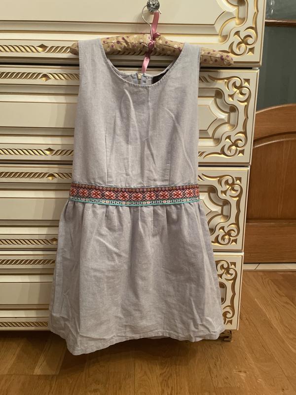 Короткое платье с вышитой тесьмой. Склад 50% льон, 50% бавовна. Сзади вырез, есть подкладка. Размер S, ткань не тянется, на небольшой рост.