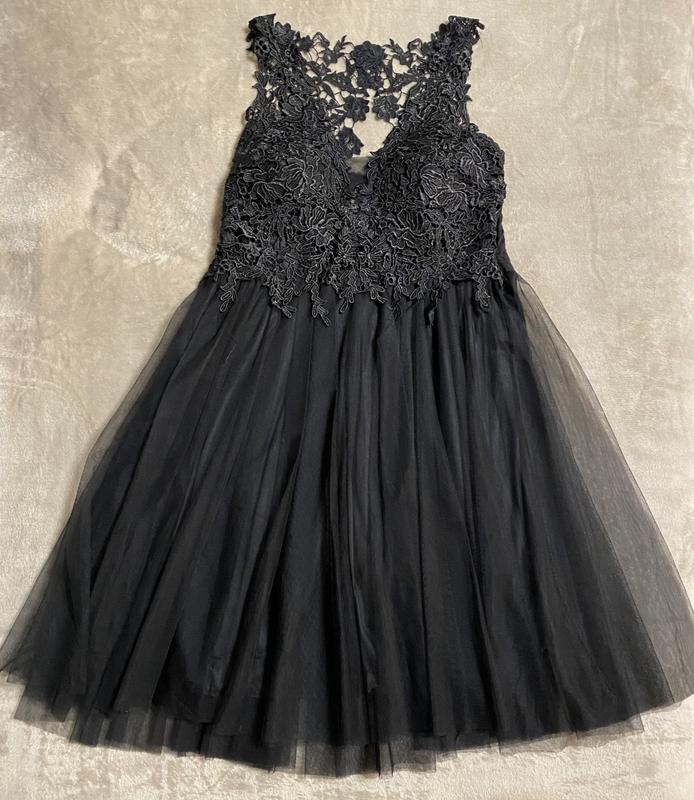 Коктейльна сукня чорного кольору, нова з біркою, з кружевними вставками та резинкою на талії, (видно на другому фото), резинка тягнеться, розмір М, довжина плаття від брительок до низу -92 см. Також є чашечки. Нижня спідничка тканина атлас та верхній шар - фатин. Можливий торг.