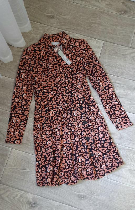 Мини платье в анималистичный принт, имитация запаха, сбоку пуговицы в качестве декорации, размер 12 плечи 39 см рукав 61 см пог 41 см пот 38 см поб 50 см длинна от плеча 88 см тянется