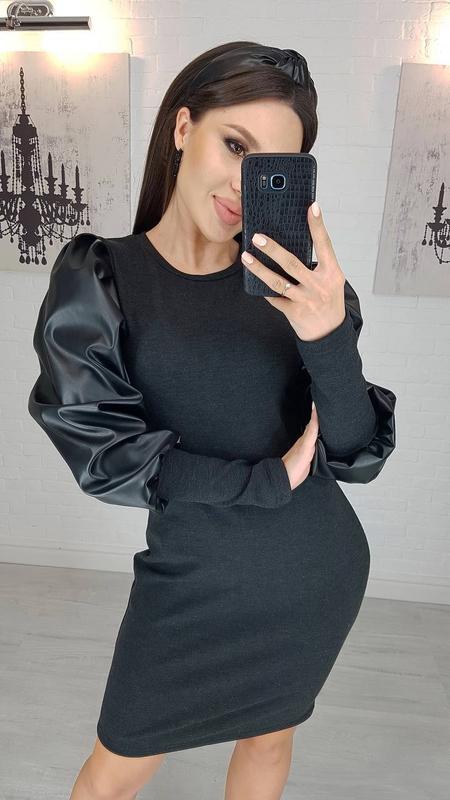 Сукня Модель: #1163 Ткань:турецкий трикотаж с эко-кожей Цвета: черный, графит Размер : 42-44 Замеры: ог 84 см, ос 98 см, длина по спинке 90 см, рукав 75 см