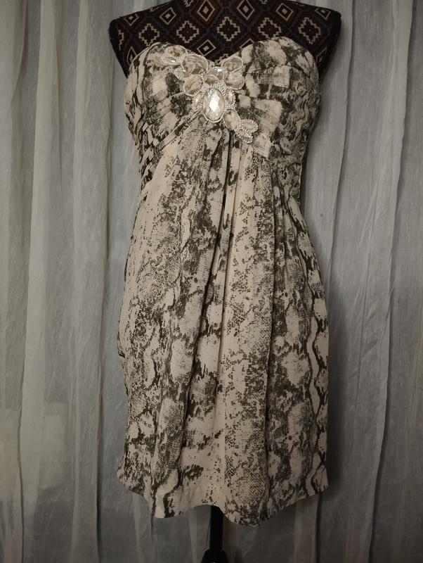 Платье-бюстье на косточках и подкладкой. Имеет драпировку и украшение на лифе. Спинка на застежке-молнии. Цвет: светло-бежевый с розоватым оттенком. Состав: 100% полиэстер (шифон). Лиф продублирован хлопковой подкладкой, юбка - полиэстерной. Замеры: обхват грудей - 84 см, обхват талии - 70 см, обхват стегон - 100 см, длина изделия – 62-67 см.