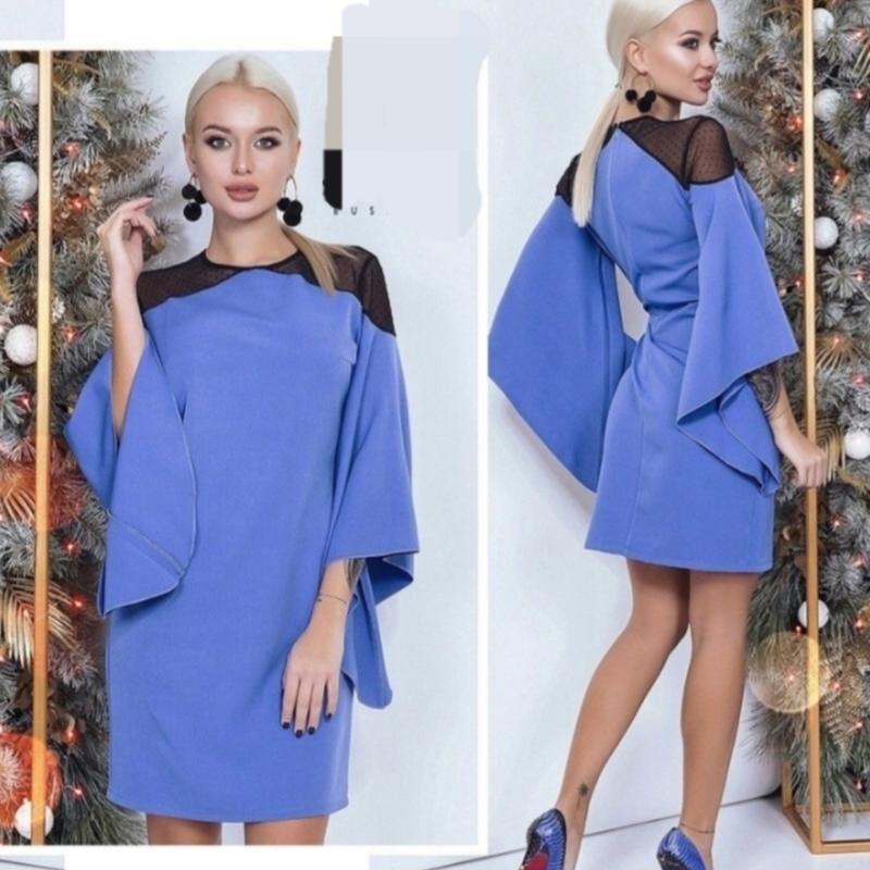 Платье, Платье Модель 211 НОРМА Нова ціна -280грн 🔥 распродаж Оригинальное коктейльное платье С широкими длинными рукавами асимметричной неуклюжей формы «Каскад» Декольте спереди и сзади выполнено из сетки в горошек. По спинке - потайная молния. Тканина: модуль, сітка в горошок. Размер: 42-44. Цвет: голубой 1 шт код1805(дар)