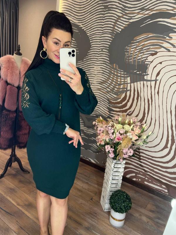 дивовижно красиве, тепле і затишне плаття прямого силуету з високим горлом, на гумці внизу і рукавах, зігріє вас в холодну пору року і буде мати чудовий вигляд на роботі, вечірці і в повсякденному житті, воно виконане з трикотажу машинного в'язання, приємного на дотик, високої якості декорованого яскравою ефектною аплікацією із сітки і пришитих страз розмір оверсайз 42-46 довжина 96-98 см, пг 46-48 см добре тягнеться, довжина рукава від шиї 66-68 см код 0496