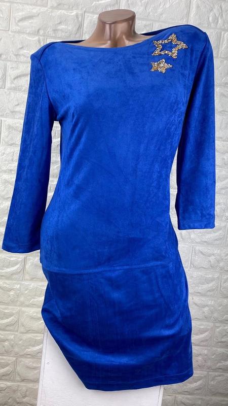 Очень стильное и красивое платье из экозамши, цвет насыщенный синий, садится по фигуре, не маломерит, на размер укр. 48, длина 110 см, ПОГ 51 см, ПОТ 39 см ПОБ 53 см, ткань немножко тянется, красиво садится по фигуре.