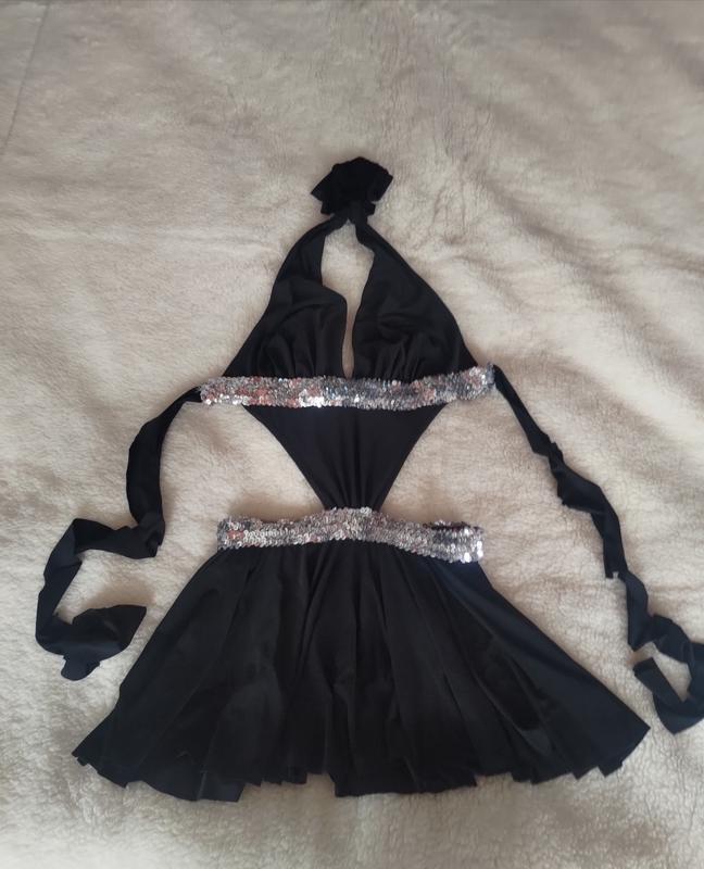 платье для бальных танцев (латина). в районе бедер и под грудью пайетки серебряного цвета. ткань тянется. на шее и спине на завязках. с втачаными трусиками. юбочка мини. спинка голая. размер один. на рост 165-170 см.