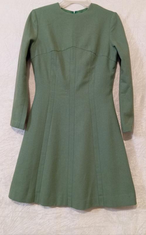 Винтажное платье оригинального кроя. Желана модель коллекционеров изысканной и качественной одежды. Невероятное пошив, доказывающее эсклюзивность производителя. Приталенная, подчеркнет утонченность фигуры. К сожалению, у бирки бренда нет. Рукав 3/4. Цвет не яркий. Ткань костюма плотная, теплая. Платье идеальное, без какого-либо нюанса. Нюансы на подкладке (7 и 10 фото), есть потертости на горловине только сзади и на вытачках. Которых не видно, когда платье на теле. Плечи - 38,5 см Пог - 46 см Пот - 38 см Пос - 51 см 1/2 по низу - 64 см Длина рукава - 54 см Ширина рукава в пройме - 15,5 см Ширина рукава по низу - 11 см Длина платья - 92 см