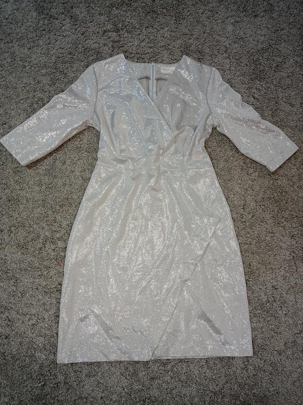 Платье блестяще с эмитацией на (запах) На замок, черенковый рукав имеет небольшое декольте красиво ложится по фируги имеет небольшой нюанс в зади есть небольшие затяжки при свете незаметны