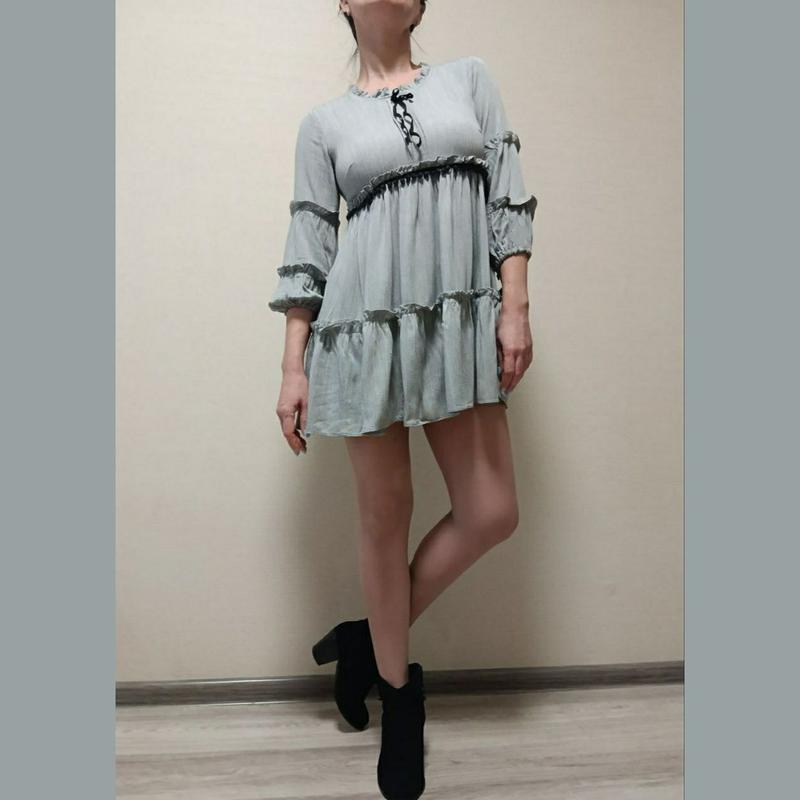 Ярусная мини-платье, цвет серый с тоненькой бежевой полоской, размер XS-S(на фото одето на М и рост 165), рукав- 3/4, состав- 70% полиэстер, 25% вискоза, 5% эластан НОП-36 НОГ-45(+виточки) длина-77 длина рукава -45