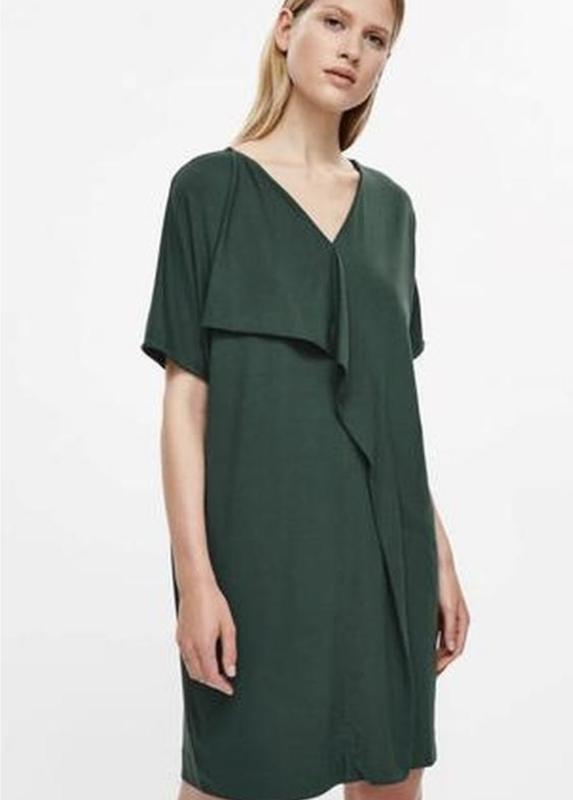 платье COS свободного кроя. Цвет - бутылочный (темно-зеленый). Размер указан xs, реально подходит также на s. Ткань тяжелая, тянется. Два боковых кармана. Ширина от проймы до проймы 55 см Ширина по стегнах 54 см Ширина по низу 49 см Длина по спине по центру 89 см Ярлики и бирки повреждены приценке в магазине. При необходимости сделать дополнительные фото и ответь на вопрос. Состав: 92% вискоза, 8% эластан