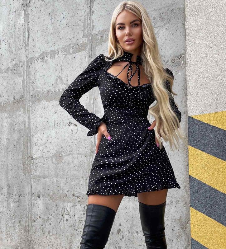 Платье мини трапеция корсетное воротник стойка на завязке фигурный вырез рукав длинный по...