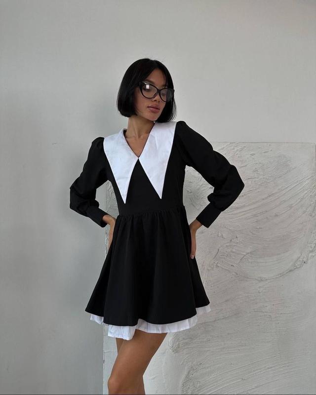 Мы нашли то же платье с воротничком и это любовь с первого взгляда Классическое платье, которое можно применить к любому запаху. Юбка двойная как на фото. Размеры: 42-44, 46-48 Цвет: черный Тканина: котон Арт 1545-463