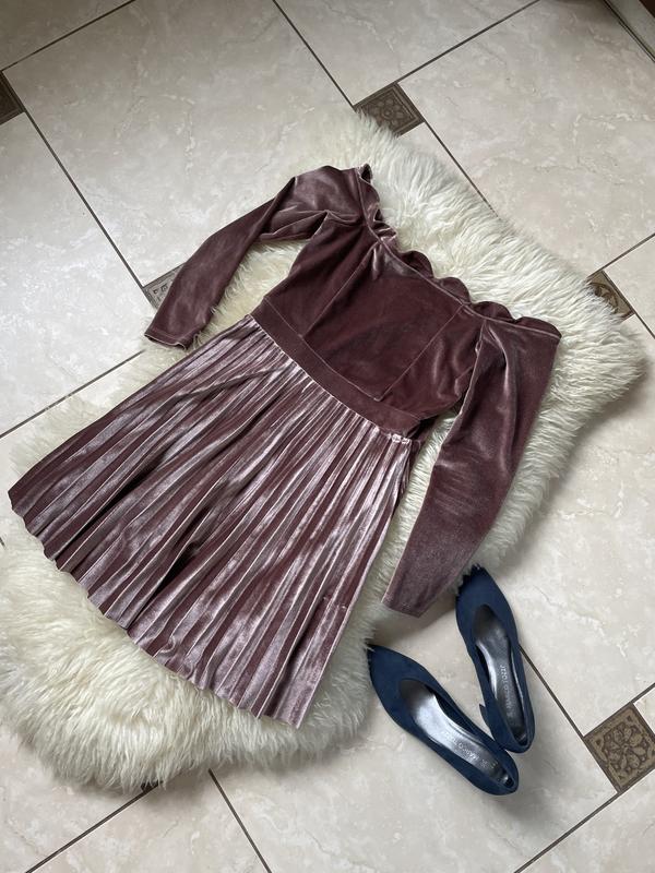 Нежное коктейльное платье Бархатная в плиссировку Спущенные рукава Стан - идеальный