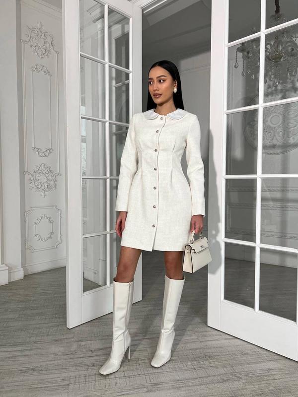 Сукня "MIU" Ціна 2000грн Розмір : XS,S,M,L Довжина рукава 60 см Довжина по спинці 85 см Тканина твід на шовковій підкладці Склад: поліестер 80% , 20% вовна Тип догляду: Хімчистка з перхлоретилену. Не використовувати машинне сушіння. Прасувати при максимальній температурі 110 градусів. Відбілювати заборонено. Якість люкс !