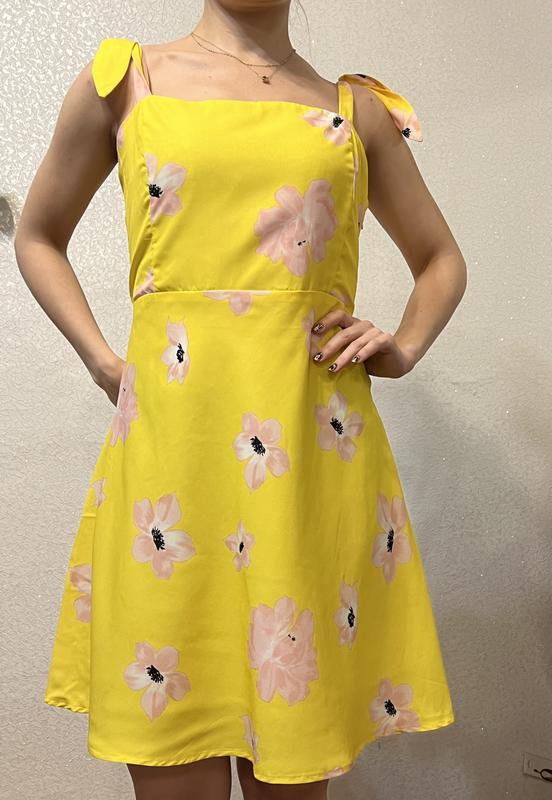 Літня сукня з завʼязками на плечах Є підюбник з бавовни Збоку блискавка Напівобхват в грудях-42см( на спинці резинка) Талія-37см Дожина-85см(регулюється за рахунок завʼязок на плечах)