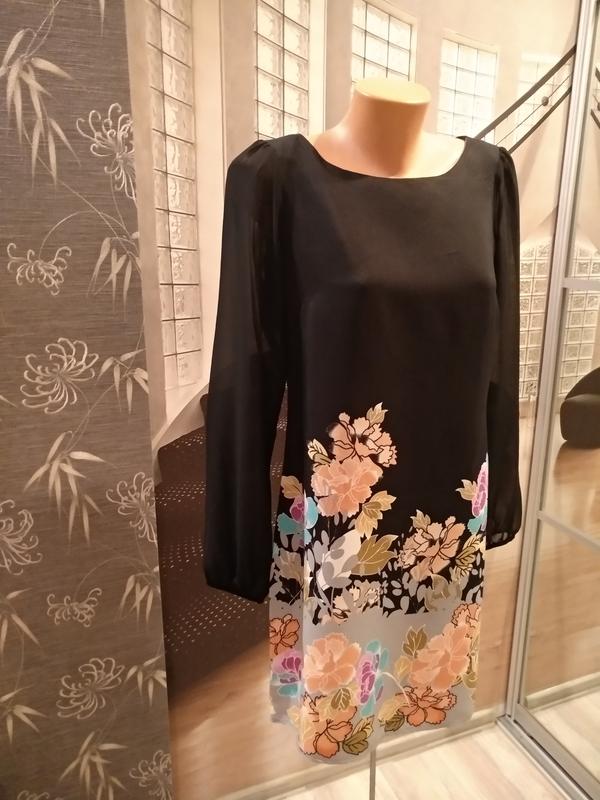 эффектное платье цветочный орнамент красиво переходит в черный фон платья рукава полупрозрачные можно носить на контрасте с грубыми ботинками или высокими сапогами складник 100%вискоза рукава 100%полиэстр размер 12