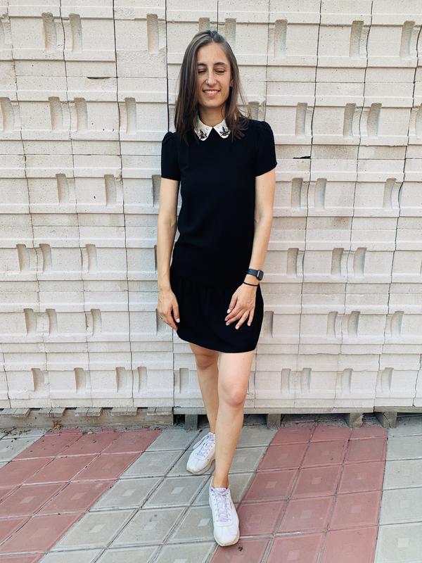 Черное платье, внизу волан, на воротнике стрикоза из камешки. Рост модели 170. Вещь новая, с биркой.