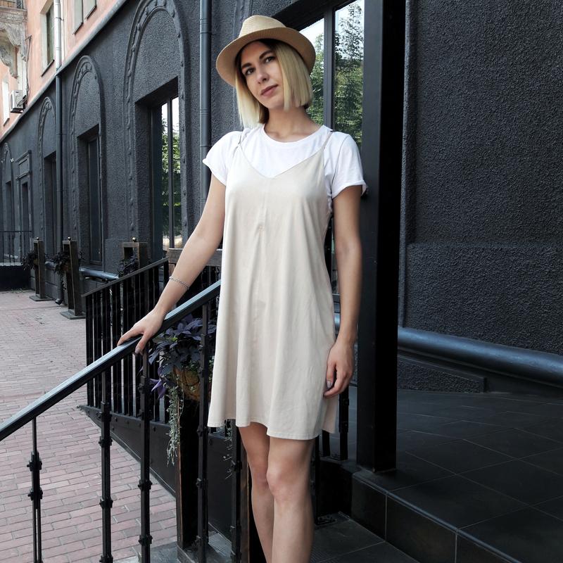 Актуальное платье-трапеция, выглядит очень стильно. Продается только платье, без футболки. Можно носить отдельно или в сочитании с футболками. Впереди ткань на ощупь напоминает эко-замш, приятное к телу. Размер М ( UK 12, EURO 40) На фото надето на S.