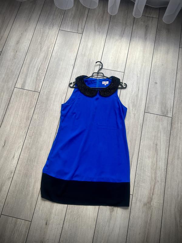 Суня прямого кроя, в сочетании двух цветов, насыщенного синего и черного. Воротничок в камушках, ткань легкая. стан 10/10 Замеры: Длина - 89см ПОГ - 50см ПОБ - 55см