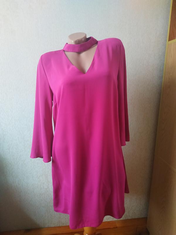 Нова сукня-трапеція з чокером, гарний колір фуксія. Довжина від плеча 87 см, Пог 51 см, низ 69 см, плечі 38 см, рукав 49 см, висота декольте 17 см