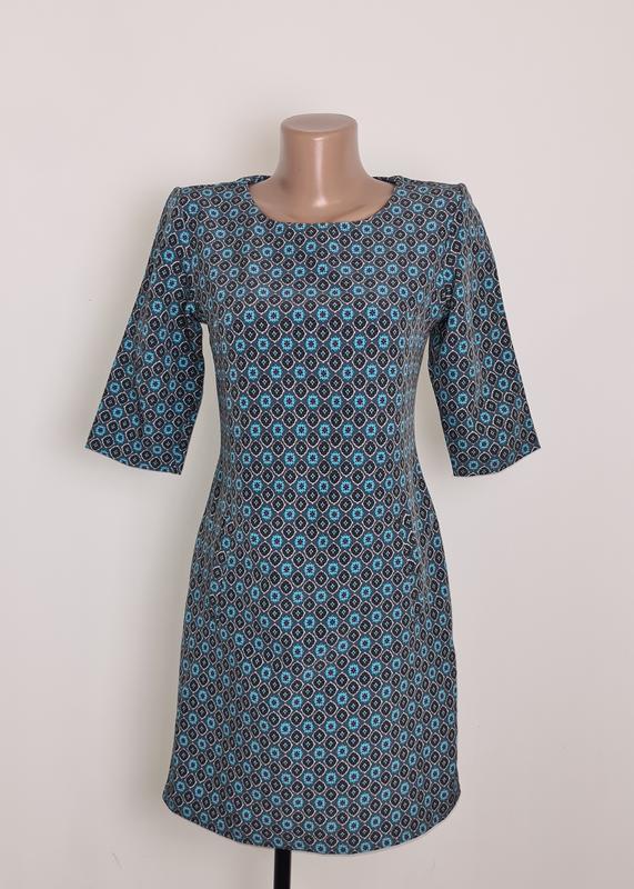 Очень красивое платье в мелкий принт, подойдет на каждый день. Тканина стрейчева. Есть два кармашка. Размер 42: объем по груди 86 см, по талии 74 см, по бедрам 90 см, плечо 7 см, рукав 34 см, длина по спине 80 см.