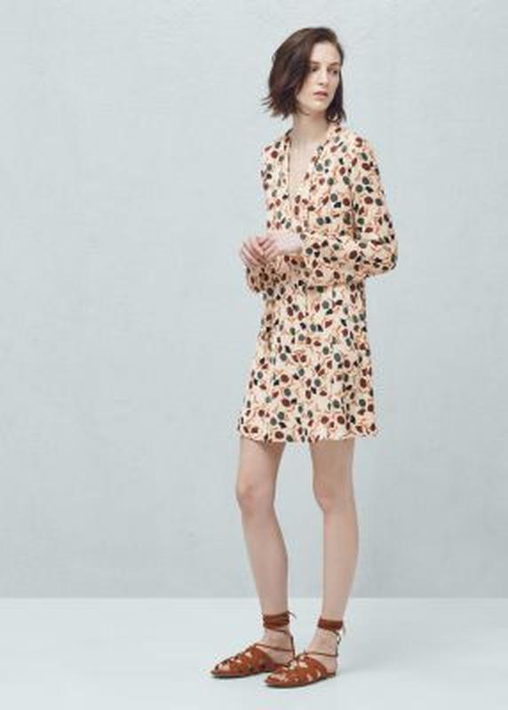 Ця сукня від Mango - ідеальний варіант для літнього гардеробу. Вона виконана з легкої тканини в мінімалістичний квітковий принт, який додає їй свіжості і романтики. Сукня має вільний крій, довгі рукава і V-образний виріз зі стрічками, які можна зав''язати в бант. Вона також має підкладку, яка забезпечує комфорт і непрозорість. Ви можете носити цю сукню з босоніжками, кедами або балетками, а також доповнити її аксесуарами за вашим смаком.