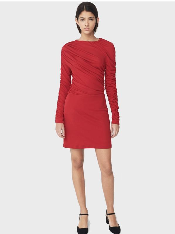 Вечернее платье с драпировкой в верхней части и на рукавах, приталенного силуэта, круглый вырез горловины. Благодаря драпировке скрывает недостатки. Состав: 83% ацетат, 17% полиамид. Цвет более вишневый Размер S Длина 94 Грудь свободная, ткань тянется Рукав реглан 39-52 Рукав с середины 43 На уровне отреза талии 39 Бедра 45