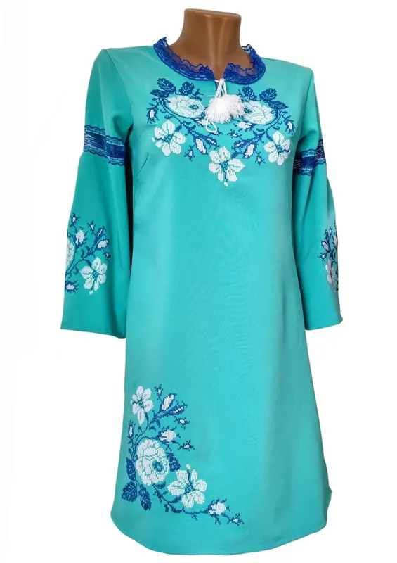 Вышитое платье с длинным рукавом с цветочным орнаментом на бирюзовой ткани
