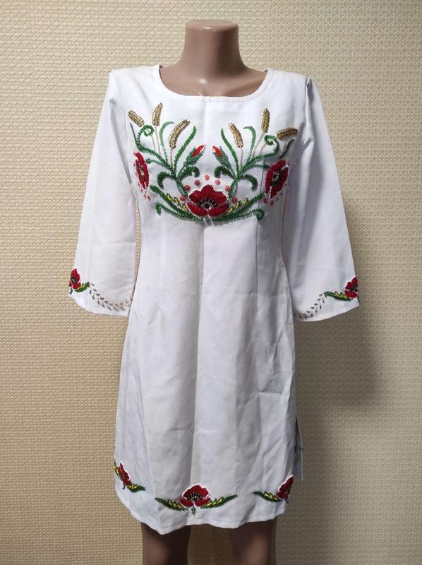 Туника-платье, которая шилась под индивидуальный заказ, вышитый бисером. На худи девушка. Длина 81 см, ширина 37 см, ширина бедер 47 см, ширина плеч 35 см, длина рукава 43 см. Имеет по бокам разрезы 13 см.