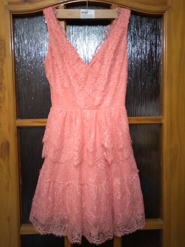 Нежное платье для хрупкой девушки персикового цвета от известного бренда BCBGMAXAZRIA. Ткань гипюр, есть подклад. Сзади застежка молния 26 см. Размер XXS. ЗАМІРИ : НОГ - 40 см Пот - 30, 5 см Длина от плеча- 82см Длина от линии талии - 47 см. Стан идеален в целом, но на подкладе есть две маленькие зацепки (последнее фото).