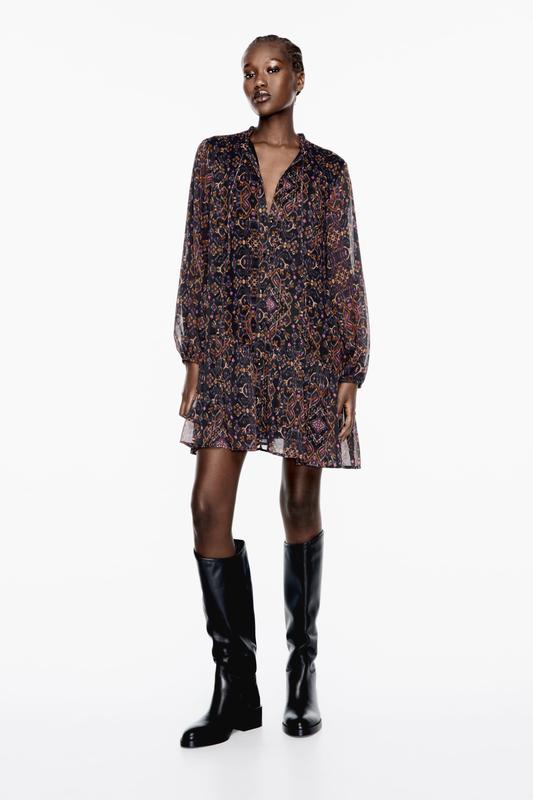 В НАЯВНОСТІ РОЗМІР XS МОЖЕ БУТИ НА S ЗАМЕРЫ РАЗМЕР S п.о. грудь: 46см п.о талия: 48см п.о бедра: 50см плечо от линии воротничка: 11см длина рукава: 59см Длина платья: 85см Платье с круглым воротником и длинными рукавами. Застегивается на пуговицы спереди и имеет подкладку. Вырез, оборки и шнурки на воротнике, воланы внизу и эластичная окантовка на рукавах.