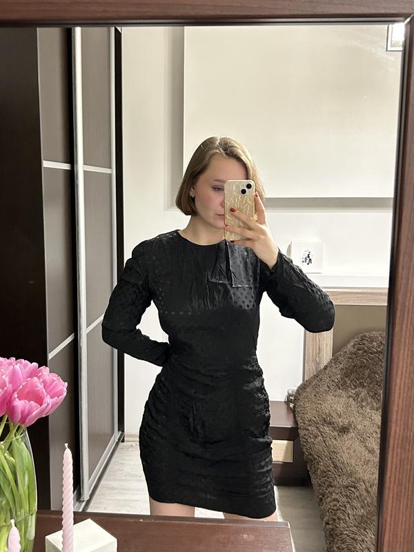 Легкий матеріал, принт горошок, але не контрастний, тому сукня класична та стримана Є драпірування внизу та на рукавах Повністю нова, з біркою. Продаю вдвічі дешевше! На мене завелика, рекомендую брати на М-L