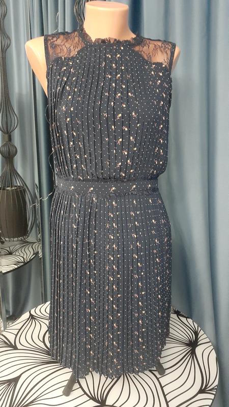 Хорошее практичное платье. Удобная и не прихотливая. Не мнеться. Красиво ложится на фигуру. Имеет акцентную циавную спинку. Из шифона. На подкладе. Качественно пошита. Заміри на фото. Размер S-M. Стан - идеальный.