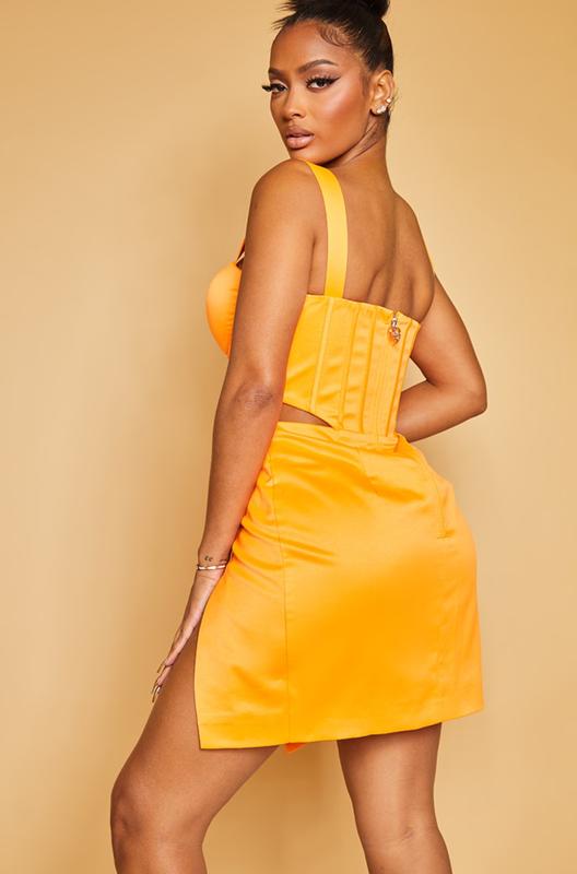 Облегающее платье с вырезанным оранжевым атласным корсетом и деталями от PLT Состояние : новое (со всеми бирками) Размер 36 S-M