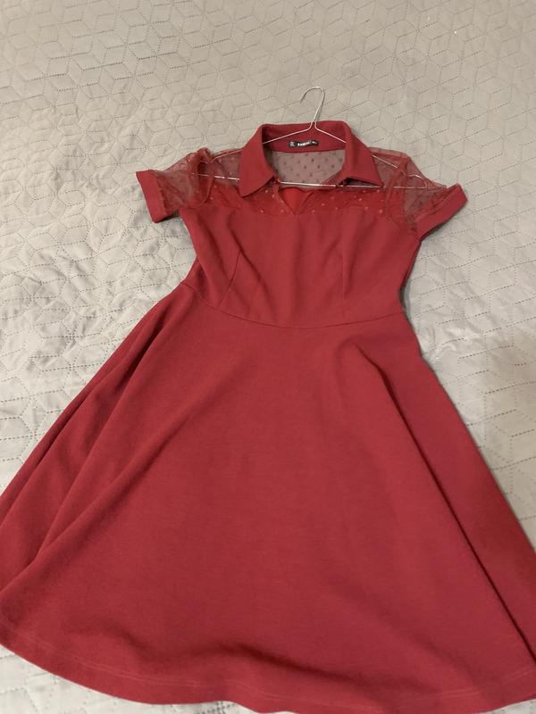 Чудова молодіжна сукня, одягалась лише раз. Колір такий як на останньому фото Довжина всього виробу від плеча - 83см. Довжина спідниці - 45см. Комір застібається на ґудзик. Збоку виробу є застібка. Матеріал: 95% - поліестер, 5% - спандекс.