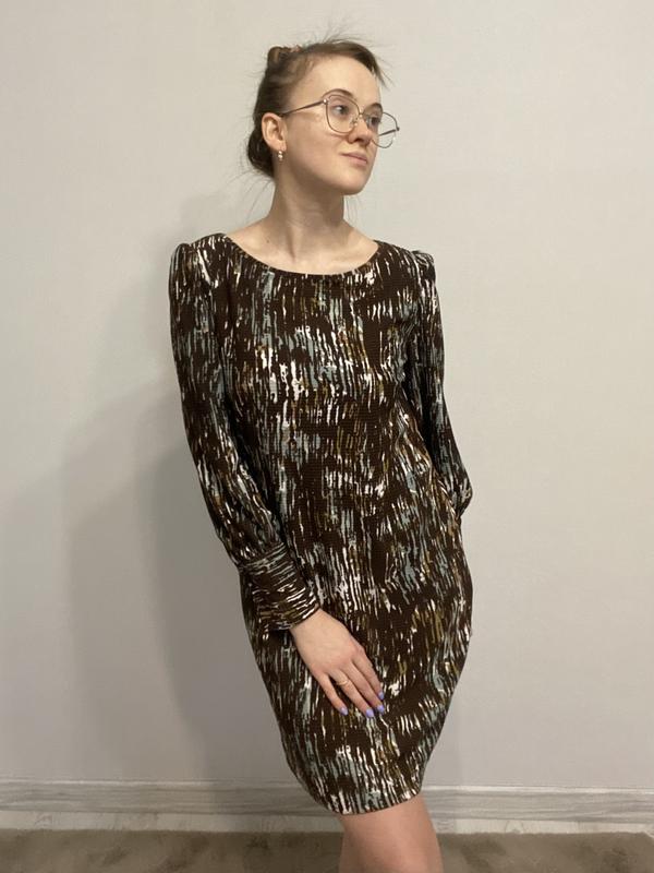 Коричневое платье с интересным принтом и акцентными плечами. Манжеты зауженные, застегиваются на пуговицы. Стан идеален. Бренд next