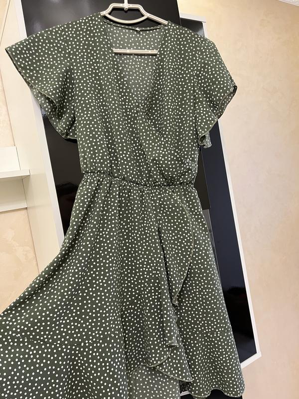 Темно зелена сукня в горошок.