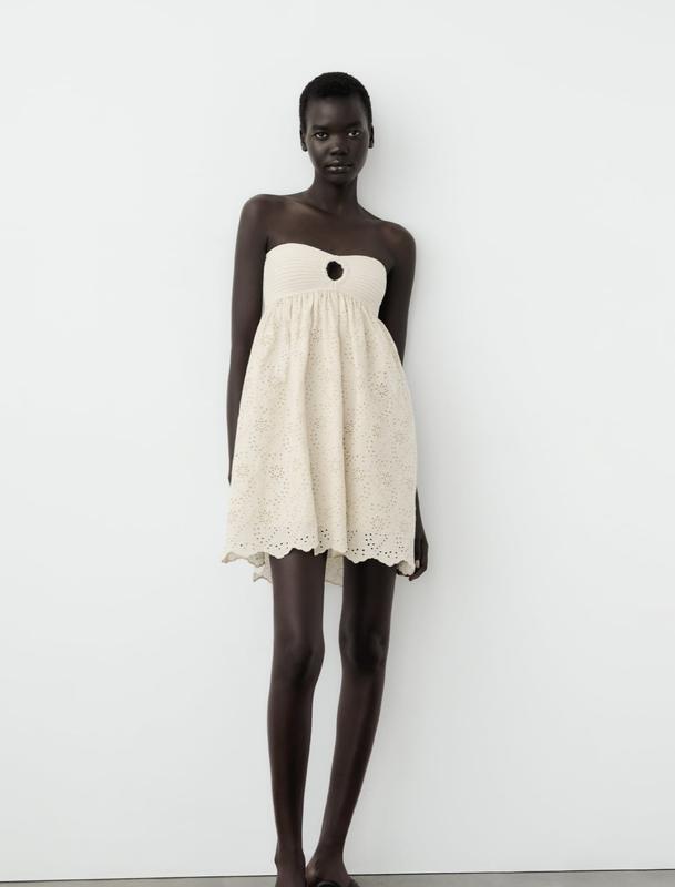 Трикотажное платье с прорезанной вышивкой представляет собой подкладку. Идеальный вариант на лето и море)