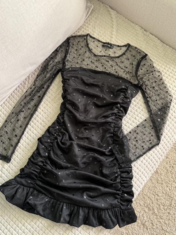 Платье сетка в горошек. Имеет подкладку которая не просвечивает. Состояние новой. Дефектов нет. Наделась буквально 1 раз в фотосессию. На ОГ 97-110 см