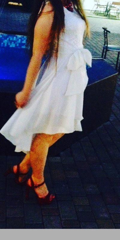 Продам очень красивое платье белого цвета. Размер 42-44. Длина платья перед 76 см, зад 110 см, ширина пояса 35,плечья 32 см. Плечи пола открыты. ОГ-88 см.