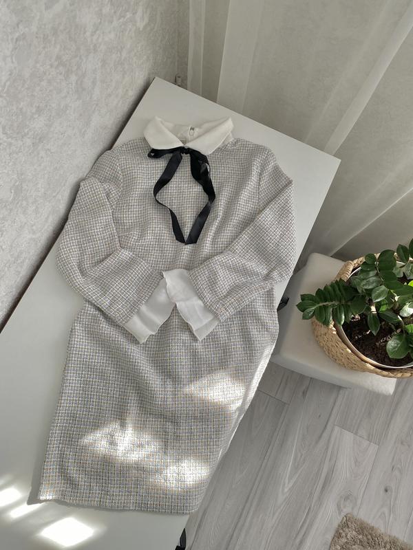 Красивое и нежное платье, в идеальном состоянии, имеет красивый воротничок, размер S (прямого кроя), чуточку на свету просвечивается, длина 81, рукав 55 см