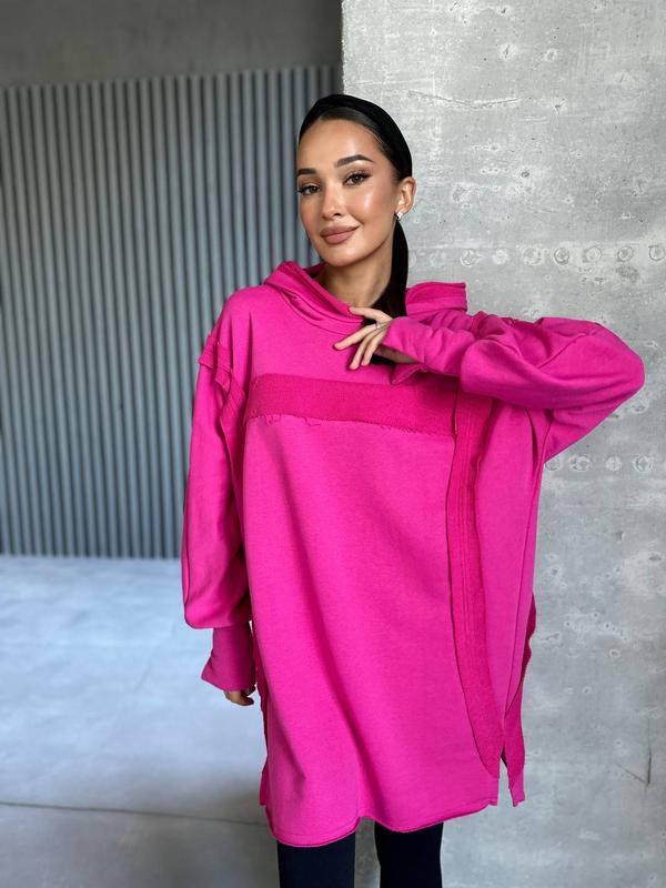 Легке осіннє плаття в стилі casual. Зручність , легкість, простота і своя родзинка! Сукня у спортивному стилі з капюшоном можна носити під будь-яке взуття.Тринитка, з якої виконана модель, м'яка та приємна до тіла. ▫️Модель 815 ▫️Тканина трьохнитка петля Турція ▫️Розмір універсальний 42-46 ▫️Колір васильок,малина ▫️Виміри ▫️груди 130 ▫️Талія 120 ▫️Рукав з плечем 75 ▫️Довжина 82