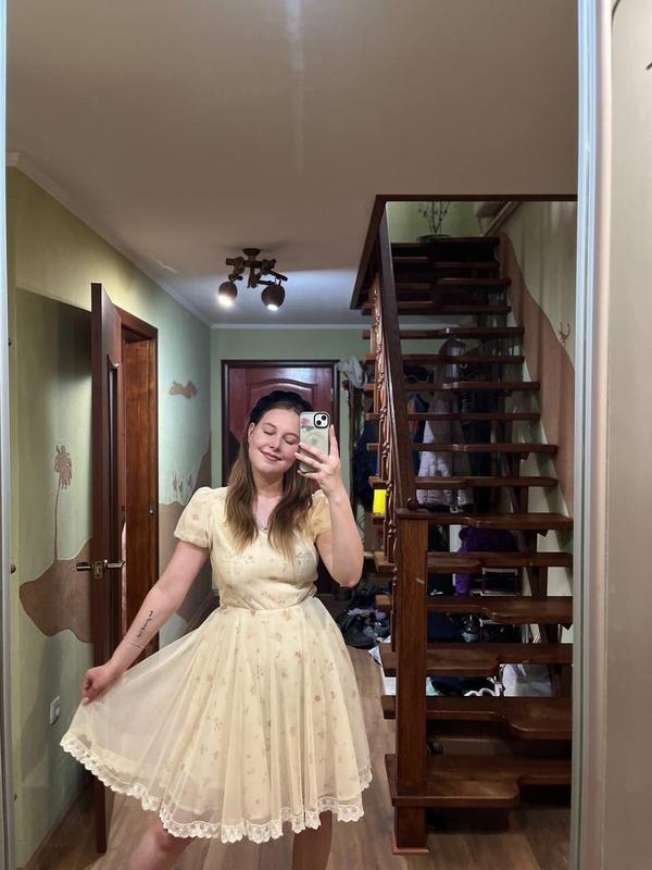 Винтажное платье Размер S-M Замеры: Грудь: 46 см Талия: 37 см ( регулируется поясом) Длина: 91 см Длина рукава: 17 см Плечи: 33 см Мои настройки на фото: 92-72-103 Платье сидит еще свободно На талии есть пояс, с помощью которого можно сделать меньшей талией Состояние новой Бирки со складом ткани нет, но ткань приятная на ощупь