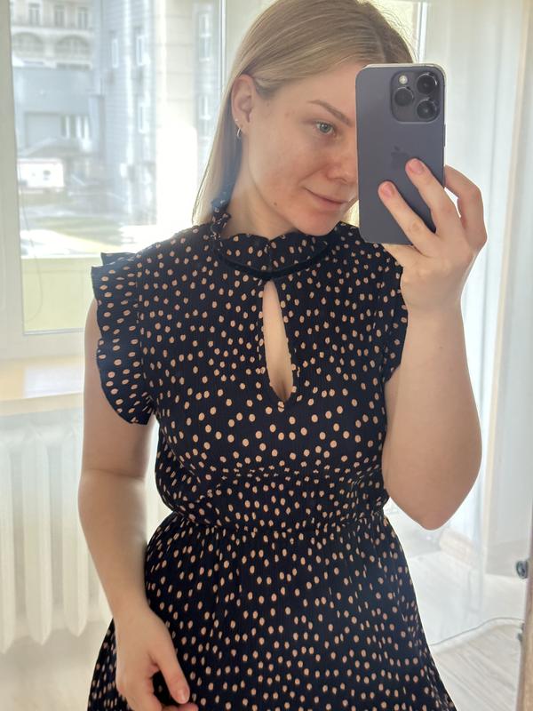 Темно-синя сукня у бежевий горох Воротник стійку можна заправити всередину, носити розстібнутим чи застібгути Талія на резинці Вказаний розмір xs але більше підійде на s, на ОГ до 90 буде ідеально