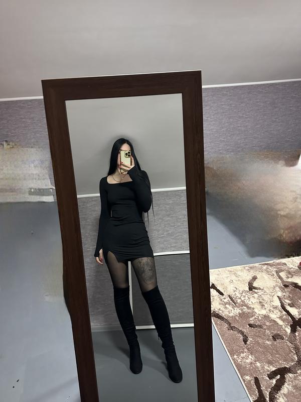 Платье на размер S - M . Длина платья 80см длина рукава 65. Рукав идет до ладошки и на пальчике вырез.