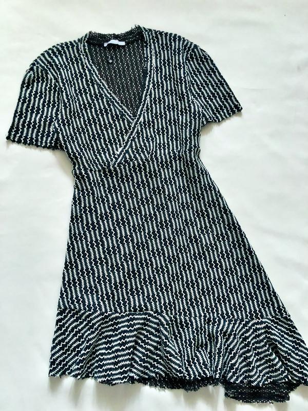 Сукня відрізна по талії , ліф на запАх , низ асиметричний, тканина напівпрозора ( поліестер, бавовна) в ідеально-новому стані, без дефектів. Довжина 76/87 см, Ног. 38 см і тягнеться, Нот. 33,5 см, Нос. + - 44 см і тягнеться.