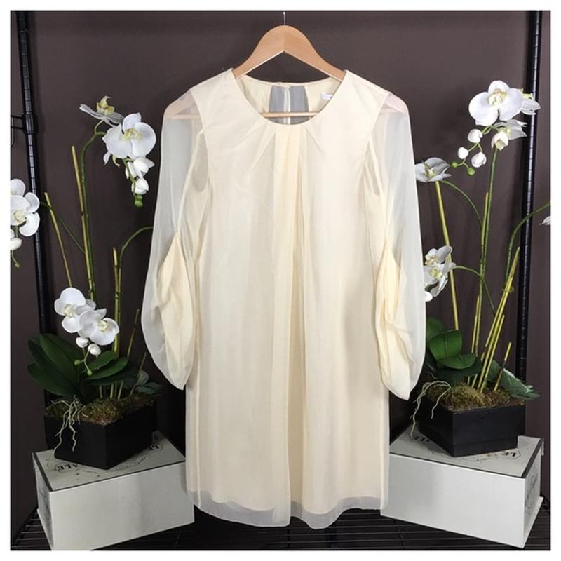 Складається з двох шарів: нижній 93% шовк, 7% спадекс - це шовк атласного типу, зверху шовк типу шифон - 100% шовк. Сукня молочного кольору. Така в стилі Гетсбі. Недоліки на 2х останніх фото. Коштувала 400$. заміри зняла по атласному шару, бо він менше. Розмір американський 4: ПОГ 44 ПОТ 45 поб 50 ПО знизу 55 довжина 84 плечі 36 рукав 53 (по найдовшій точці)